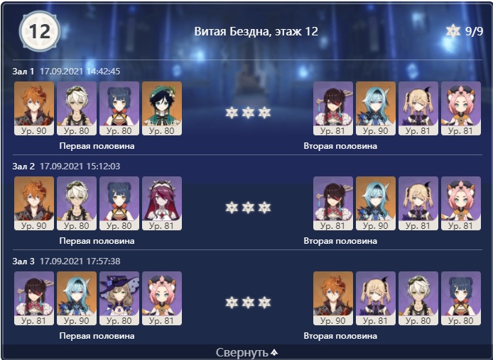 Зачем всякая имба, вот почти фри ту плей сетап для 12-3 (на с6 Тарталью можно не обращать внимание, он дамажит тут не очень сильно, просто у меня нет дамагера получше) в исполнении далеко не самого скиллового игрока (меня), куча попыток, без топовых артов, Эола чисто фри ту плейная - с0 и с р1 крафтовым мечиком с горы, если выкинуть Тарталью и заменить хотя бы на с0 мастера Дилюка - наверное против босса на 12 этаже это даже лучше будет (у меня до сих пор Дилюка нет, так что приходится Тортом разваливать вообще везде, где он подходит и где нет, я им даже океанида убиваю), только суппортов надо перетасовать под Дилюка.