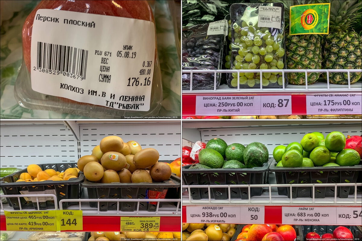 Еще экзотика: персики — 480 руб/кг., абрикосы — 465 руб/кг., лайм — 683 руб/кг., авокаджо — 938 руб/кг., ананасы — 175 руб/кг (дешевле огурцов).
