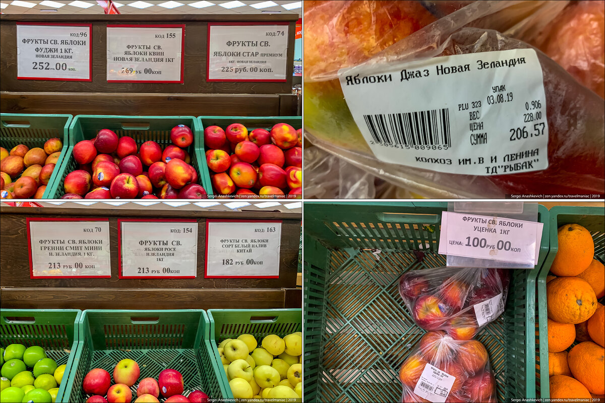 Яблоки — все сплошь Новая Зеландия или Китай, стоят от 200 до 270 рублей за килограмм. Даже подгнившие уцененные не падают ниже 100 руб/кг.