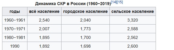 присоедини к себе нигерию и у тебя общий скр будет 5. так же и ссср. где в рсфср скр ниже вопроизводства. и в таджикистане 5 детей рожают в аулах. где дем переход еще не произошел. неуч. общий скр же в любом случае был 1.8 по оф данным