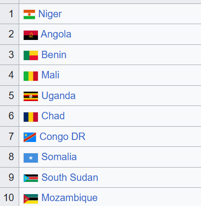 И ровно наоборот про самый высокий уровень рождаемости. Вот топ 10 стран: