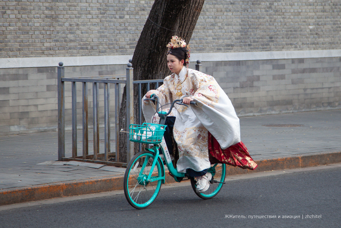 Китайская принцесса куда-то спешит на прокатном велосипеде