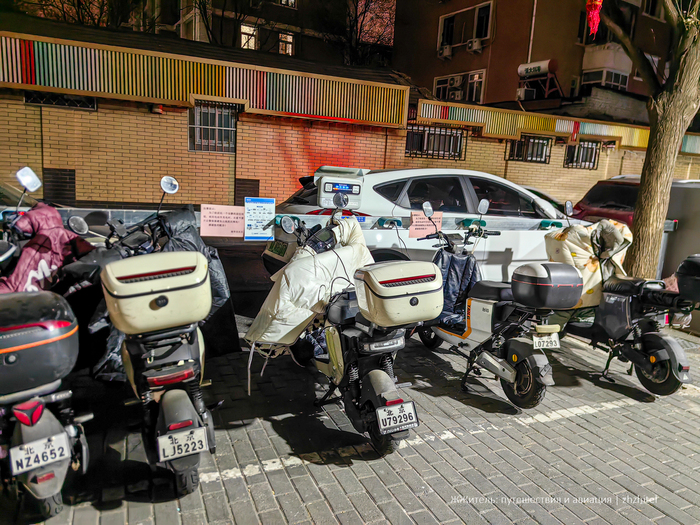 Электрический мобильный транспорт в Пекине всё же есть. Электроскутеры в столице Китая разрешены, но подлежат строгой регистрации. Также они должны соответствовать ограничениям по скорости (не более 25 км/ч) и массе (до 55 кг без батареи). Важно: на них нужно получать номерные знаки, а скоро будут требовать наличие шлема. Электроскутеры часто используют службы доставки. Около жилых домов можно увидеть стоянки для электроскутеров с зарядками.