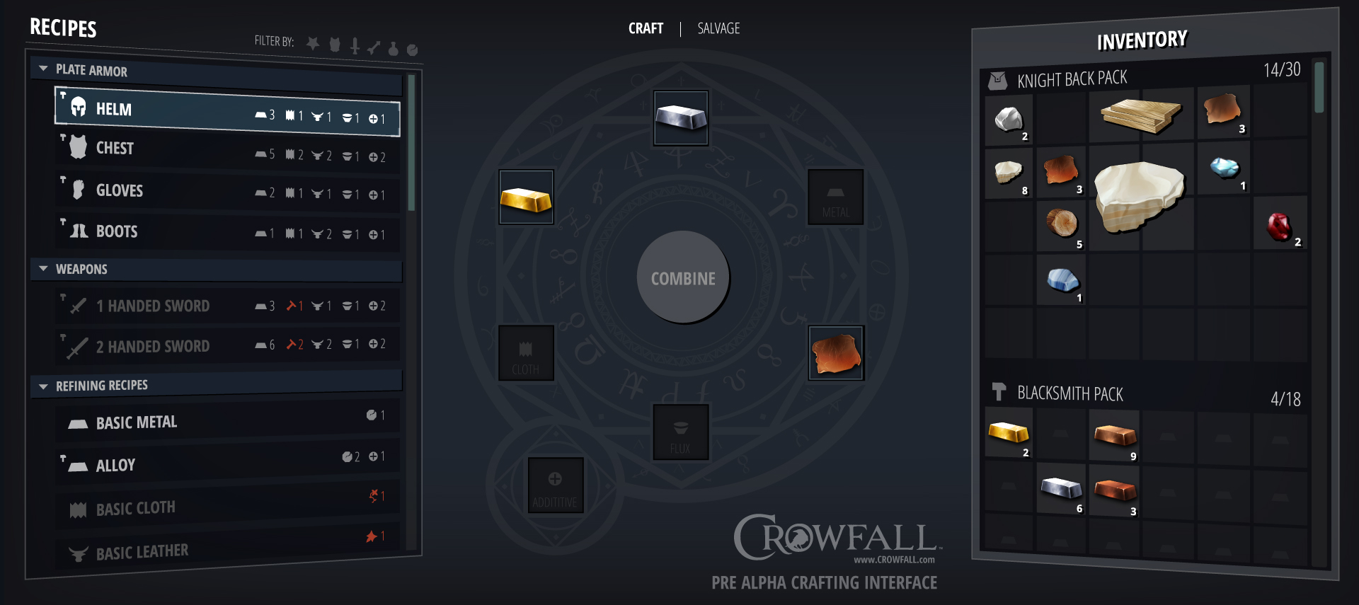 Система рецептов Crowfall достаточно гибкая, так как тут нет жесткого ограничения на ингредиенты. Например, у вас в книге есть рецепт «Латный шлем». Для него необходимо 3 куска металла, 1 кусок ткани, 1 кусок кожи и дополнительный элемент. Игрок может выбрать какие уровни (tier) этих ресурсов положить в слоты. До тех пор, пока слоты заполнены чем-то подходящим, рецепт скрафтится. Крафтер даже может добавить что-нибудь особенное, чтобы значительно изменить предмет. Кроме того, это заставит игроков искать правильную комбинацию ингредиентов для получения желаемого результата. В общем, многое будет зависеть от самого игрока и от того, какие товары он хочет скрафтить и как.