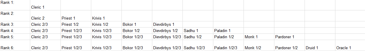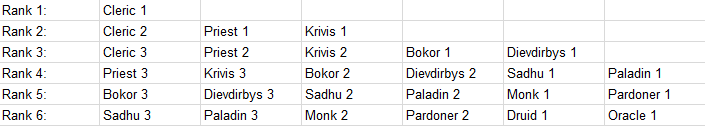 1/2/3 signifies circle 1, circle 2, circle 3 respectively, I listed all of them on classes that you can achieve, because it depends on your previous choices (i.e choosing Krivis at rank 2 means at rank 3, Krivis circle 2 is available, and at rank 4 Krivis circle 3 is also available, but it depends on what you choose)