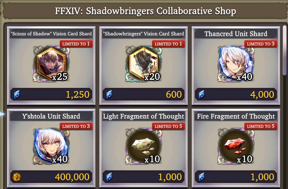 Коллаб персонажи, даже с других ФФ игр являются лимитированными и их дюпы и шарды доступны только на период коллаба, так что расчехляйте свои мастеркарды.