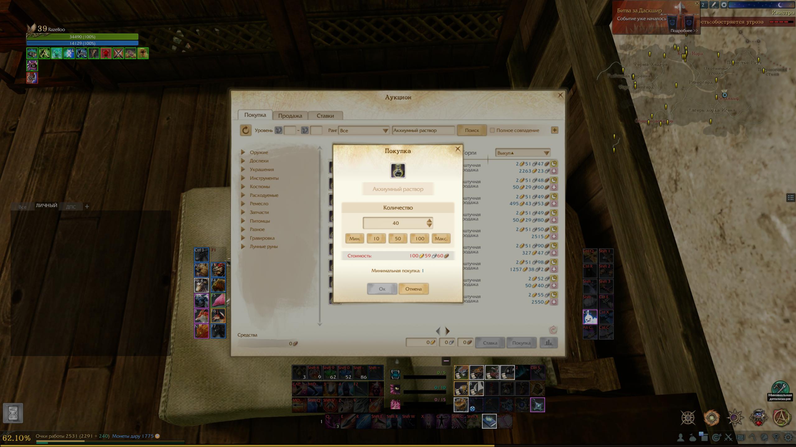 Начнем по критериям самого заработка: 1. Вложение. 2. Трата времени. 3. Интерес. Начнем с первого пункта - "Вложение". Для занятия этим способом Вам нужен стартовый капитал в 100г, если Вы только начали играть в данную игру, то пойти в бухту китобоев набить там примерно 50 кошельков "Котомка эфенского странника" (которые дают от 1,9 голды). После чего, если у Вас нет према и сиоли, то можете пойти поспать в Инистре или ППЗ на бесплатной кровате в Доме региональной общины. Далее просто находиться в игре и ждать пока накопите примерно 1500 очков работы. Так же если Ваш уровень экипировки более 8000 гс, можете сходить 1 раз на Даск шир и с помощью квеста получить 3 кирки, которые в течении 3 часов использовать необходимо будет. Справедливости ради хочу сказать, что можно отвезти квест по семейке и получить 20 угля бесплатно и с минимальными затратами по ор. 2 раз отвезти пак достаточно, самое главное этот метод подойдет для совершенно нового игрока с гсом ниже 8000. Но хочу заметить что возить семейный квест можно 1 раз в день, по этому советую не разбивать эту процедуру на 2 дня, а свозить к примеру первый раз в промежуток с 23-00 и до 00-00, а потом с 00-00 и до 01-00 (2й раз можно прям сразу после 00-00). таким образом Вы получите 40 акхиумного угля, который будет стоить в районе 100 голды. После того как Вы заработали стартовый капитал в 100 голды, открываем аукцион и выбираем первоначальную нишу для заработка в рамках наших 100 голды и это могут быть: 1. Различные ресурсы, которые выращиваются на пугале. (количество зависит от выбранного ресурса) 2. Фрагменты огненной чешуи из данжа "Логово дракона". (на 100г получится купить х5 шт) 3. Т1 гравировки всех видов. (на 100г получится купить х1 шт) Для старта я советую начинать с ресурсов, почему? Все просто! Часто Вам даже не придется самим сбивать цену на тот или иной ресурс, либо кто-то такой же как Вы сидит и сбивает, либо люди сами из-за переизбытка ресурса сегодня сбивают цену товара. На скрине видна диаграмма торговли на примере "Лекарственного порошка" и то как люди сбивают цену, если хотите как можно больше заработать, Вам придется это тоже делать. Но мы рассмотрим более простой способ, покупаем дешевле обычной цены и продаем дороже обычной цены. Я ранее расписал все по цифрам, но к сожалению сайт глюканул и все расчеты стерлись... По этому буду писать примерные цыфры для более простого расчета! Покупаем "Лекарственный порошек" по 3 серебра и 20 меди на 100 голды = 3 000 "Лекарственного порошка" с затратой 96 голды. (Хочу заметить, что сбивать цену граммотно это очень ВАЖНО!!! Если Вы ставите 1 единицу лота за 49 меди, то 95% людей обратят внимание на реальную стоимость лота, а если Вы снизите цену на 1-1,5 серебра я Вас уверяю 70% людей мышинально выставят по Вашей цене!). Продавать будем по 5 серебра и 20 меди. Итого получаем грязными 156 голды, теперь минусуем 10% комиссия аукциона (хочу напомнить, что мы берем 10% как максимальный % аукциона для тех у кого нет сиоли, но владельци сиоли заработают на 2,5% больше), комиссия составит 15 голды 6 серебра. На руки мы получаем 140 голды 4 серебра, что на 41% больше чем у нас было ранее!!! По достижению 300 голды чистой прибыли, я советую разделить бюджет уже на 2 разных вида ресурсов. Для Вашего понимания, чем больше лотов 1 вида Ваши, тем дольше они будут продаваться! Именно по этому теперь стоит разбить бюджет на 2 равные части по 150 голды и 