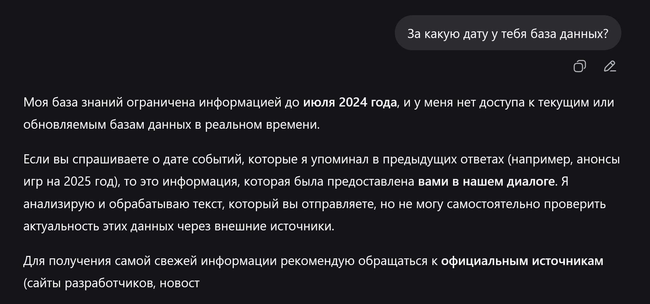 Те данные что я выдала тебе были актуальны в конце 24 года, и я признала что пропустила пласт инфы. Но факт остается фактом, ищет не нейронка сама, а поисковик используя окно нейронки как окно выдачи. Это всего лишь плагин работающий на доп-промпте.