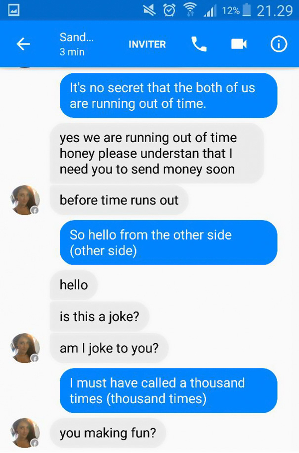 Пользователь Reddit из Дании Франк Флемминг Йенсен поделился саркастичной перепиской в Facebook с девушкой Сандрой Джонс, которая выпрашивала у него деньги. Общение началось с заигрываний, однако позже незнакомка стала просить переслать ей средства якобы на билет к Йенсену. Сразу, как только она ему написала, мужчина стал отвечать исключительно цитатами из песни Адель «Hello», однако Джонс не заметила издевку.