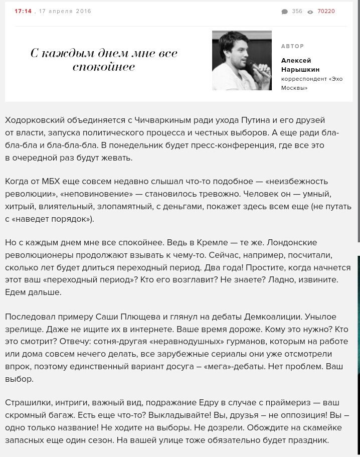 "Мои 17 лет пришлись на 1991 год. Вся шваль, что сейчас критикует Путина, была у власти. Я не помню ничего, что они хорошего сделали. Я помню, как развалили мою страну, я помню, как люди годами не получали зарплату, как профессор ядерной физики работал у меня и мездрил шкуры косой, как моя мама, отработав 23 года старшей медсестрой детской реанимации, вытащившая с того света не один десяток детей, стала челноком-торгашом.