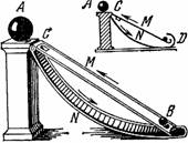 Сильный магнит А помещается на колонке(рис. 99). К ней прислонены два наклонных желоба М и N, один под другим, причем верхний М имеет небольшое отверстие С в верхней части, а нижний N изогнут. Если, - рассуждал изобретатель, - на верхний желоб положить небольшой железный шарик В, то вследствие притяжения магнитом А шарик покатится вверх; однако, дойдя до отверстия, он провалится в нижний желоб N, покатится по нему вниз, взбежит по закруглению D этого желоба и попадет на верхний желоб М; отсюда, притягиваемый магнитом, он снова покатится вверх, снова провалится через отверстие, вновь покатится вниз и опять очутится на верхнем желобе, чтобы начать движение сначала. Таким образом, шарик безостановочно будет бегать взад и вперед, осуществляя <вечное движение>.