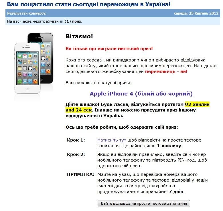 Неужели есть народ, который еще ловится на такое? Сегодня вот картинку заливал, вроде и сайт достаточно серьезный, вдруг иллюминация, голые девки, шампанское "вы победитель!!". Ну я уже фишку знаю, но стало интересно, чем на этот раз попытаются развести, зашел: