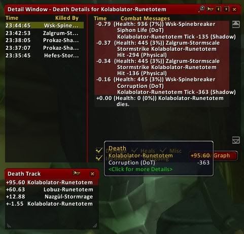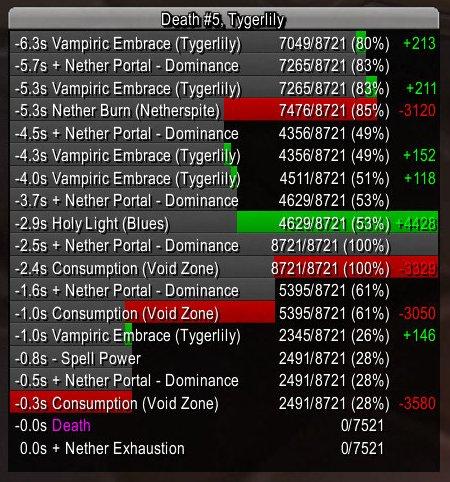 Не мне нужен аддон где будут показано именно последние секунды а не весь комбат лог хоть и по частям. В рекаунте такого вроде бы нет. Плюс там все разбито на отдельные разделы-тоесть чтобы узнать почему например танк упал нужно лезть во входящий дамаг, искать там что было с танком, потом искать в другой закладке входящий хил и совмещать...