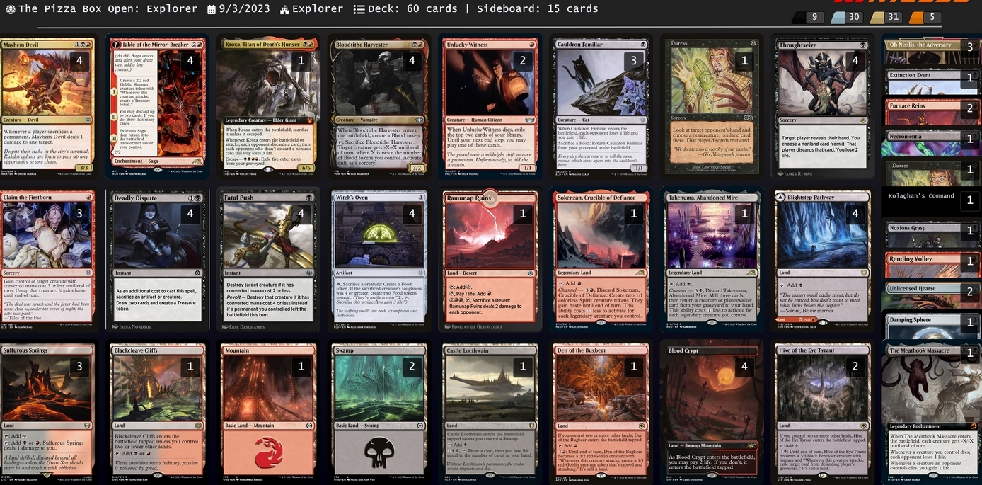 2 Unlucky Witness 3 Cauldron Familiar 4 Thoughtseize 4 Fatal Push 4 Witch's Oven 3 Claim the Firstborn 4 Fable of the Mirror-Breaker 4 Bloodtithe Harvester 4 Mayhem Devil 4 Deadly Dispute 1 Den of the Bugbear 2 Hive of the Eye Tyrant 2 Swamp 1 Mountain 1 Blackcleave Cliffs 3 Sulfurous Springs 4 Blood Crypt 4 Blightstep Pathway 1 Takenuma, Abandoned Mire 1 Sokenzan, Crucible of Defiance 1 Ramunap Ruins 1 Kroxa, Titan of Death's Hunger 1 Castle Locthwain 1 Duress Sideboard 1 Noxious Grasp 1 Duress 2 Furnace Reins 1 The Meathook Massacre 1 Extinction Event 1 Necromentia 3 Ob Nixilis, the Adversary 2 Unlicensed Hearse 1 Kolaghan's Command 1 Rending Volley 1 Damping Sphere Азориус рамп. 5-1 ![]() Deck