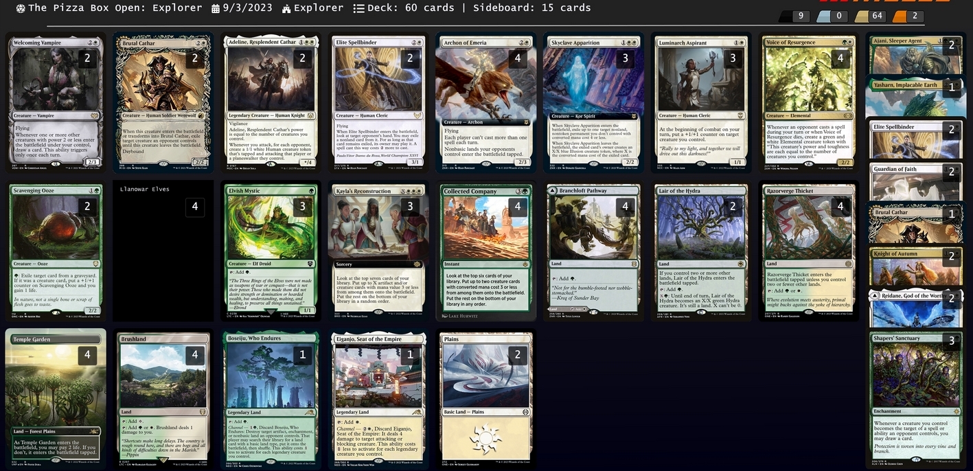 2 Plains 4 Voice of Resurgence 4 Llanowar Elves 4 Brushland 2 Scavenging Ooze 4 Temple Garden 4 Razorverge Thicket 3 Elvish Mystic 4 Collected Company 4 Archon of Emeria 3 Luminarch Aspirant 3 Skyclave Apparition 4 Branchloft Pathway 2 Elite Spellbinder 2 Lair of the Hydra 2 Adeline, Resplendent Cathar 2 Brutal Cathar 2 Welcoming Vampire 1 Boseiju, Who Endures 1 Eiganjo, Seat of the Empire 3 Kayla's Reconstruction Sideboard 3 Shapers' Sanctuary 2 Elite Spellbinder 2 Guardian of Faith 1 Brutal Cathar 2 Knight of Autumn 1 Yasharn, Implacable Earth 2 Reidane, God of the Worthy 2 Ajani, Sleeper Agent Ракдос сак ![]() Deck