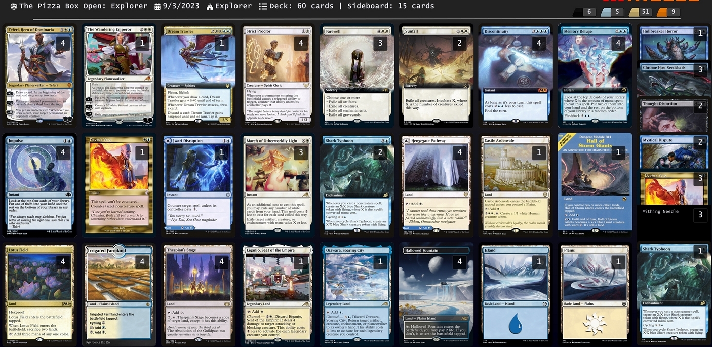 1 The Wandering Emperor 4 Hallowed Fountain 4 Impulse 4 Thespian's Stage 4 Irrigated Farmland 4 Teferi, Hero of Dominaria 1 Dovin's Veto 4 Lotus Field 1 Castle Ardenvale 1 Jwari Disruption 1 Dream Trawler 2 Shark Typhoon 4 Discontinuity 4 Hengegate Pathway 4 Strict Proctor 1 Hall of Storm Giants 4 Memory Deluge 3 Farewell 3 March of Otherworldly Light 1 Eiganjo, Seat of the Empire 1 Otawara, Soaring City 2 Sunfall 1 Island 1 Plains Sideboard 3 Dovin's Veto 2 Mystical Dispute 1 Shark Typhoon 1 Hullbreaker Horror 3 Pithing Needle 2 Thought Distortion 3 Chrome Host Seedshark |
