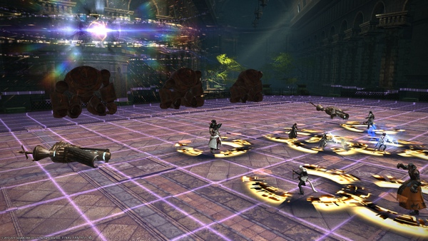 ![]() ![]() С базовыми атаками разобрались, теперь разберём механики. В какой-то момент сражения, босс подлетает к центру арены и готовит умение Maintenance. При этом, от него исходят потоки энергии, которые оживляют отключенную технику на арене. Красный поток энергии оживляет турели, которые сделают небольшое АоЕ на том квадрате, где находятся. Синие линии оживляют роботов за границей арены, которые пробьют линейным АоЕ в ту сторону, куда смотрят. Несколько первых раз умение Maintenance позволит боссу активировать до 2 единиц техники за раз, но позже он сможет использовать большее количество техники. ![]() Analysis является основной механикой босса. После применения этого умения, босс покидает арены и оказывается за её границей, в то время как все игроки оглушены и не могут двигаться. При этом, под ногами у всех игроков появляется визуальный индикатор в виде неполного круга, который показывает слабые места для выстрела босса. Сначала может показаться, что брешь в круге это и есть уязвимое место, однако, на деле всё наоборот. Для того, чтобы пережить снайперский выстрел босса, необходимо определить его местонахождение и повернуться к нему незащищённой стороной. Если всё будет сделано правильно, выстрел нанесёт большой урон, но не убьёт игрока. После первого применения Analysis, босс обретает пару новых приёмов. Для начала, следует внимательно следить за умением Leg Shot, при котором на арене появятся три мины. Наступать на них не рекомендуется, так как это чревато получением большого урона и статуса Paralysis. ![]() Следующим трюком босса будет Spotlight. На арене появятся круги в виде прицелов, которые будут следовать за несколькими случайными игроками. Спустя некоторое время, прицел остановится, и в том месте произойдёт взрыв. Зачастую механика происходит за момент до применения умения Analysis. Ballistic Missle представляет из себя обычные АоЕ круги под игроками. Если вы стали целью этого умения, не подходите к игрокам, и внимательно следите за боссом, так как во время этого умения он часто делает атаку Left/Right Handgonne. Все механики и атаки будут повторятся, пока босс не будет побеждён. Расправившись с первым противником, продолжайте путь дальше. Второй босс - Agrias На пути ко второму боссу нет дополнительных групп противников и можно непосредственно переходить к сражению.![]() Первая фаза Первым делом босс использует Divine Light - стандартная АоЕ атака по всему рейду. Танкам же необходимо следить за атакой Thunder Slash, так как она является танкбастером и нанесёт большой урон по цели. К тому же, это АоЕ конусная атака, так что не двигайтесь по направлению к другим игрокам. И, среди стартовых атак стоит обратить внимание на Cleansing Flame. На нескольких игроках появятся АоЕ круги, старайтесь не стоять рядом с этими людьми. ![]() Теперь же, стоит разобрать механику Judgement Blade. Босс уходит на центр арены, и готовит атаку Judgement Blade. В это же время, на поле боя появляются два больших круга, внутри которых можно обнаружить значок щита. Зайдя в круг, игрок получит бафф, позволяющий ему активировать умение с помощью Duty Action. Благодаря этому умению, игрок выставит эфирный щит, чтобы отразить атаку босса. Однако, помните, что как только вы использовали Duty Action, не делайте никаких движений и не используйте никаких умений. В противном случае, ваша защита спадёт. Помимо этого, стоит всегда смотреть на босса при использовании щита