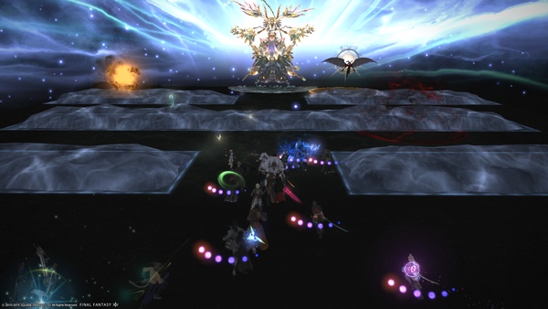 ![]() ![]() ![]() Следом за этим необходимо внимательно следить за умением Crush Helm. На танках будут накапливаться до 4 стаков дебаффа, после чего босс атакует мощным ударом всех танков. Используйте защитные умения и снимайте дебаффы с помощью Esuna. ![]() Далее, следует рассказать про две механики, в которых потребуется знать местоположение вашего альянса. Shadowblade выбирает 1 игрока от каждого альянса и вешает на него особый маркер. Этот игрок должен выбрать одну из ячеек своего альянса, отправиться туда и стоять там до того момента, пока маркер не пропадёт. Как только этот игрок получит урон от маркера, он может возвращаться к своему альянсу, в то время как на этой ячейке медленно будет расти чёрное поле, в которое категорически запрещено заходить. ![]() Второй подобной механикой является Crush Weapon. По аналогии с Shadowblade, выбирается один игрок из каждого альянса, и под ногами у этого игрока появляется красное поле. Как только оно пропадёт, за этим игроком будет следовать невидимое АоЕ (4 раза), которое при каждом появлении будет наносить урон находящимся внутри. ![]() И последней механикой перед ультимативной фазой является Duskblade.На каждой ячейке появляется один небольшой кружок, который должны заполнить как минимум три человека. Распределитесь таким образом, чтобы занять все кружки. В противном случае, все участники рейда получат большой урон. Ультимативная фаза - Balance Asunder ![]() В самом начале фазе босс перенесёт всех игроков на отдельную арену, где будут находиться три уменьшенные версии босса. Каждый танк берёт на себя одного, и для того, чтобы пережить ультимативную атаку босса, необходимо уничтожить копии до того, как шкала атаки заполнится до максимума. Финальная фаза Пережив урон от Balance Assunder, босс возвращает игроков на старую арену, и бой продолжается. Среди новых механик нужно отметить Crush Armor и Icewolf. Crush Armor представляет из себя нитку, которая привязывается к каждому из танков. Эту нитку срочно необходимо перехватить одному из игроков, и принять на себя урон с дебаффом. Нитка будет держаться какое-то время, и участники группы должны передавать её друг другу сразу после получения дебаффа (все, кроме танка). Icewolf это адды в виде ледяного кристалла, который появляется в одной из ячеек. Всего будет три адда, при том, что вокруг каждого будет большое АоЕ. Находите адда, который находится на ячейке вашего альянса, подбегайте к нему вплотную, и уничтожайте. В дальнейшем босс повторяет все предыдущие механики. Продолжайте их выполнять и вы сможете победить босса. Финальный босс - Ultima the High Seraph Победа над третьим боссом откроет путь к финальному боссу рейда и истории Return to Ivalice. Предстоит сражение с божественным существом Ultima, the High Seraph. Бой условно можно поделить на две части, где в первой вам предстоит сражаться с самим боссом и делать механики боссов из предыдущих рейдов, а во второй вы столкнётесь с финальной формой Ультимы.![]() Первая фаза ![]() Начало боя продемонстрирует основные возможности босса в первой половине сражения. Holy IV это обычная АоЕ атака по всему рейду. Aura Light является комбинацией нескольких АоЕ. Для начала, вся местность вокруг босса будет небезопасной зоной, а также от босса будут исходить три луча, которые потом превратятся в лёд. При этом, на нескольких игроках появятся АоЕ круги. Постарайтесь найти безопасное место в течение этой комбинации, и не