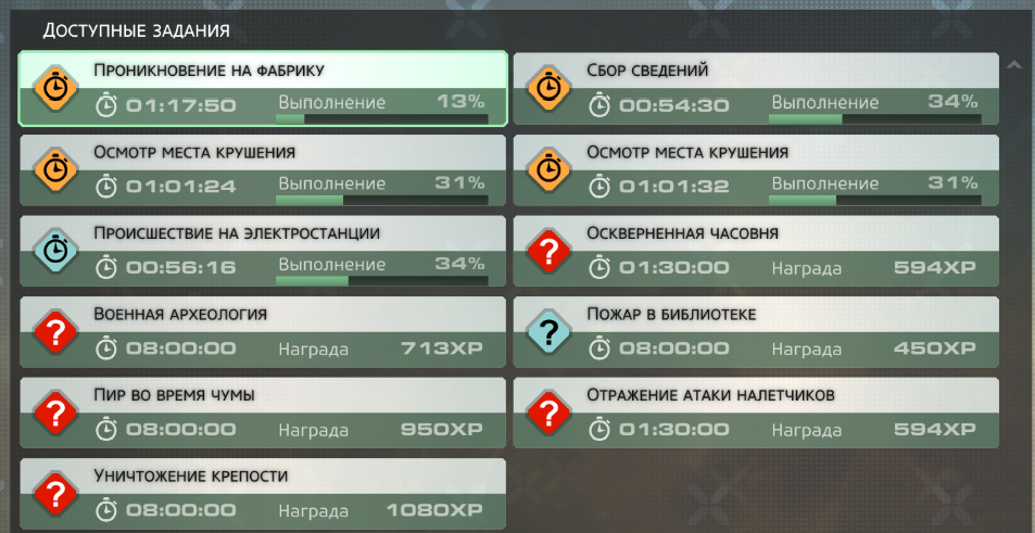 Желтые - тоже весьма полезны. Они приносят вам ресурсы: провизию и амуницию. Провизия расходуется на все голубые задания, амуниция, обычно, идет на красные.